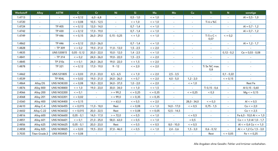 Die Wahl eines hitzebeständigen Stahles ist abhängig von den Umgebungs-bedingungen und den